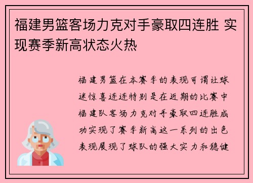 福建男篮在本赛季的表现可谓让球迷惊喜连连,特别是在近期的比赛中,福建队客场力克对手,豪取四连胜,成功实现了赛季新高。这一系列的出色表现,展现了球队的强大实力和稳健的竞技状态。文章将从福建男篮的竞技状态...
