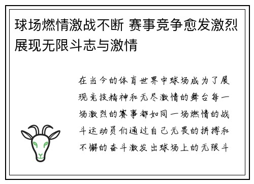 在当今的体育世界中,球场成为了展现竞技精神和无尽激情的舞台。每一场激烈的赛事都如同一场燃情的战斗,运动员们通过自己无畏的拼搏和不懈的奋斗,激发出球场上的无限斗志。赛事竞争的愈发激烈,不仅仅是为了胜利,...