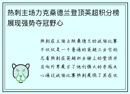 热刺在主场击败桑德兰的这场比赛,不仅仅是一个普通的英超三分,它标志着热刺在英超积分榜上的登顶,并且向外界展示了他们强大的夺冠决心。通过这场比赛,热刺展现了其在攻防两端的卓越表现以及球员们的坚定信念。此...