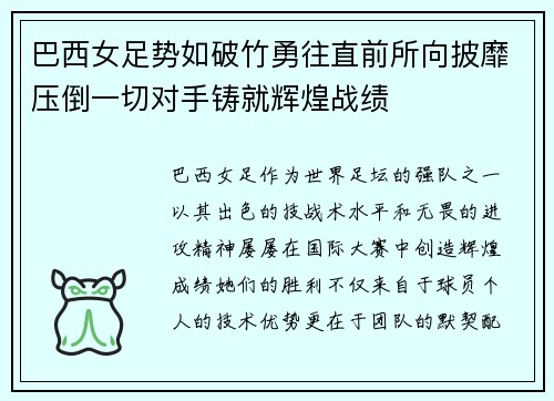 巴西女足作为世界足坛的强队之一,以其出色的技战术水平和无畏的进攻精神屡屡在国际大赛中创造辉煌成绩。她们的胜利不仅来自于球员个人的技术优势,更在于团队的默契配合和巴西足球文化的深厚底蕴。自成立以来,巴西...