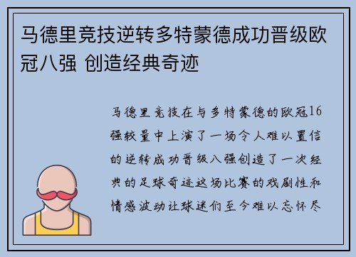 马德里竞技在与多特蒙德的欧冠16强较量中上演了一场令人难以置信的逆转,成功晋级八强,创造了一次经典的足球奇迹。这场比赛的戏剧性和情感波动让球迷们至今难以忘怀。尽管在首回合客场以2-3不敌对手,面临着不...