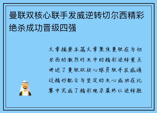 文章摘要:本篇文章聚焦曼联在与切尔西的激烈对决中的精彩逆转,重点讲述了曼联双核心球员联手发威,通过精妙配合与坚定的决心,成功在比赛中完成了精彩绝杀,最终以逆转胜利晋级四强。文章将从四个方面详细解析曼联...